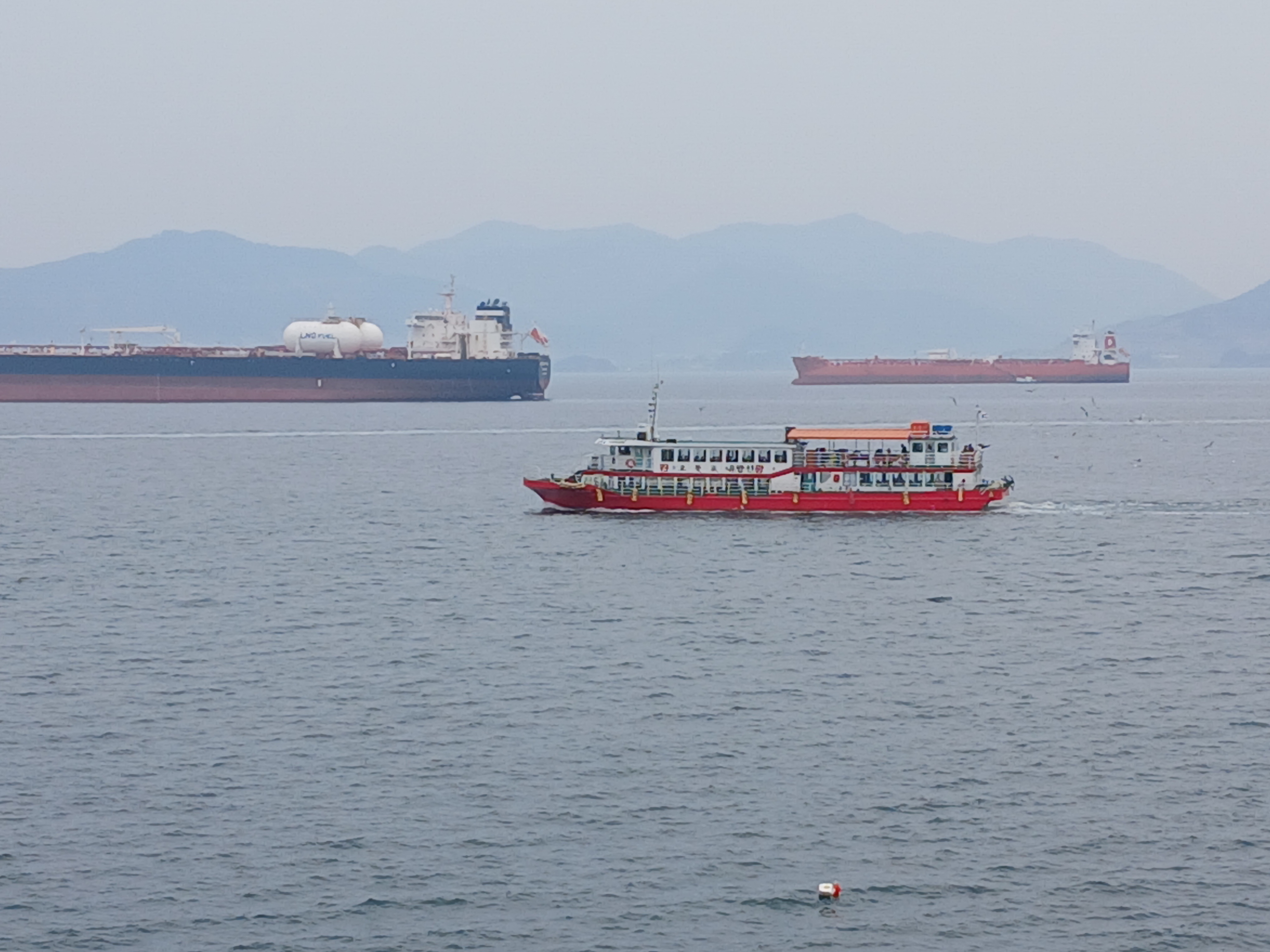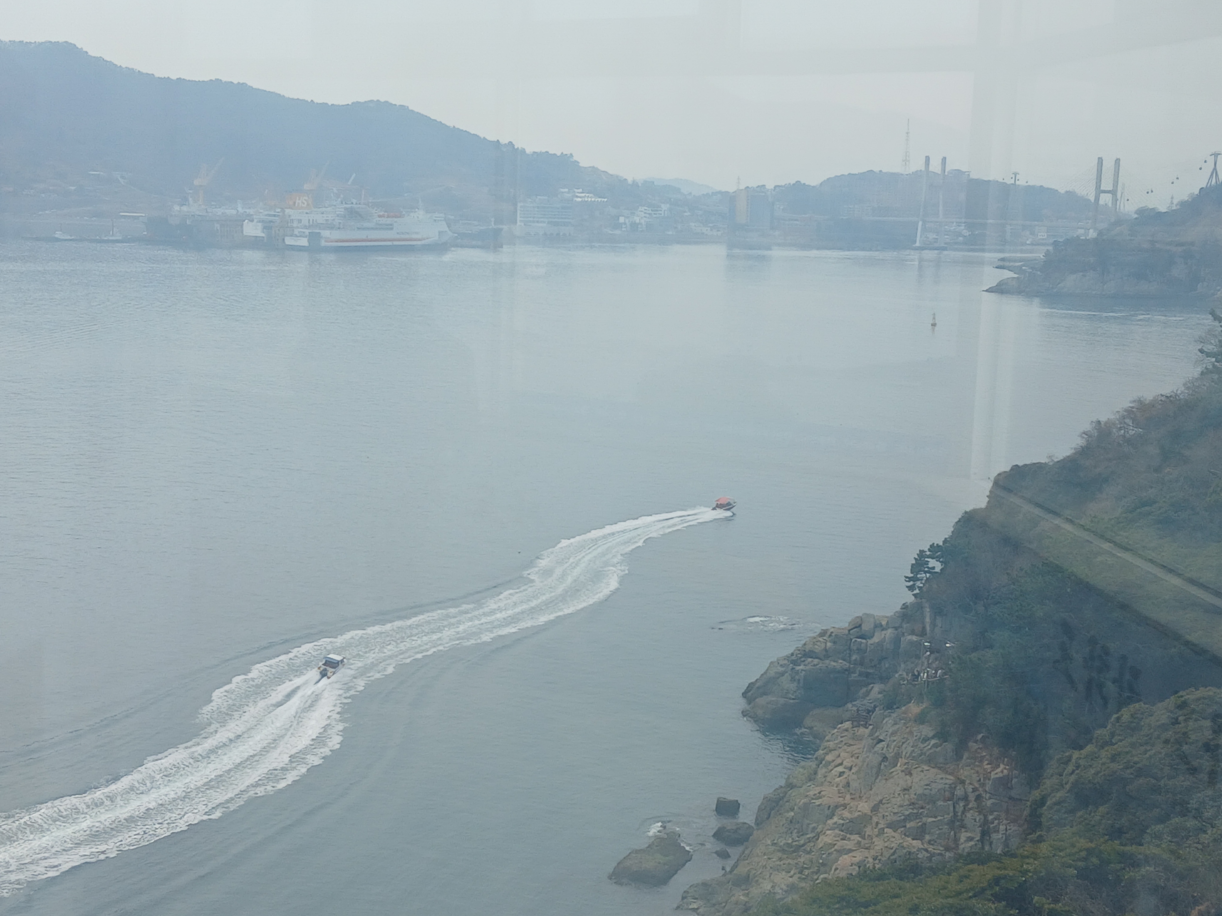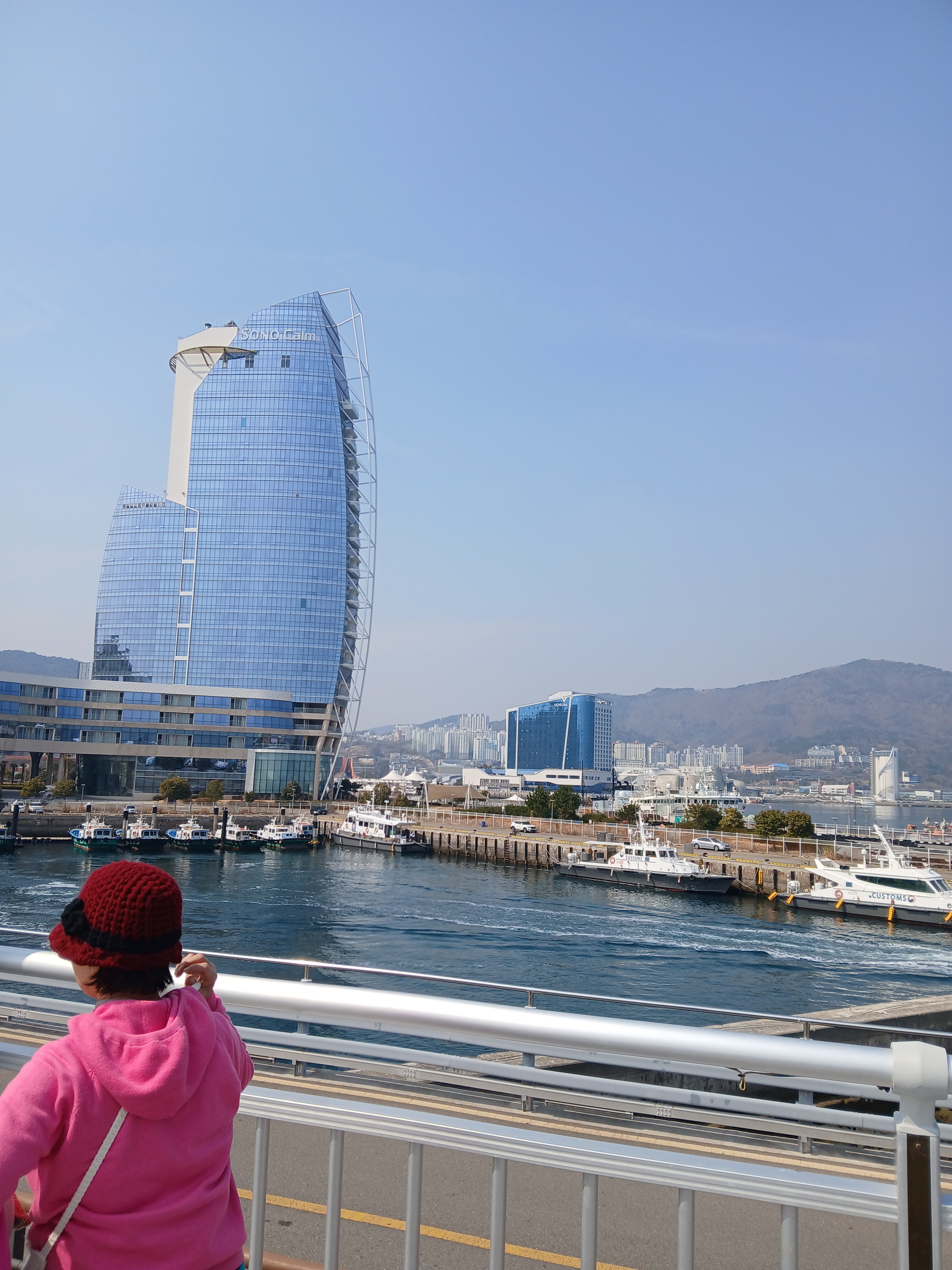 저기 건너편에 중국에서 온 크루즈가 한 척 정박되어 있다